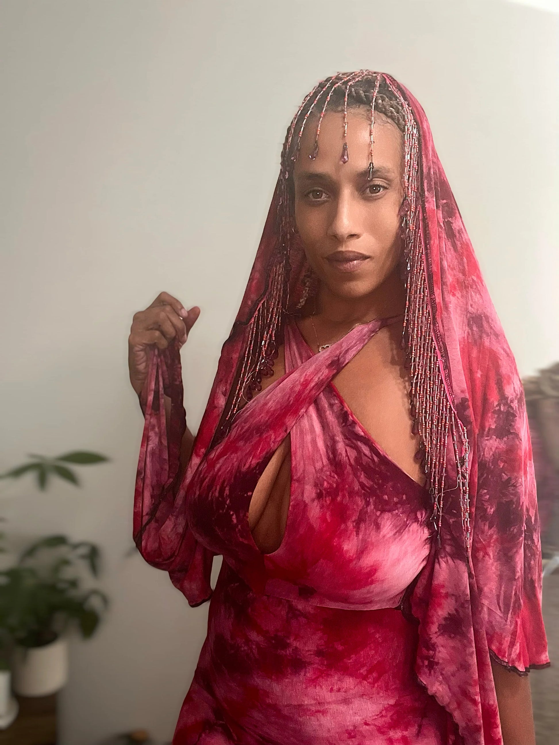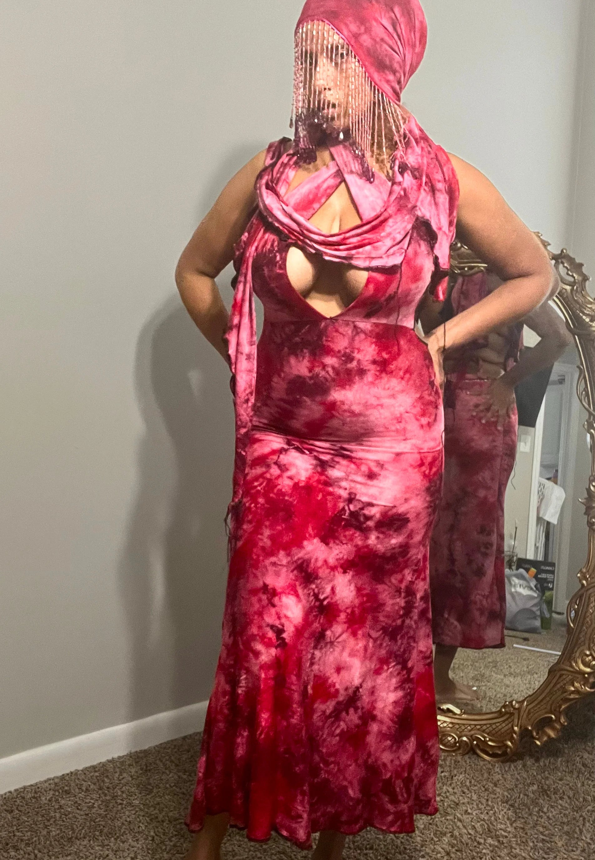 Halter top flowing down into mermaid style bottom. Matching Multiple Wrap Shawl that can me worn in many ways including as a veil/ face wrap. Beaded fringe flowing from the top.