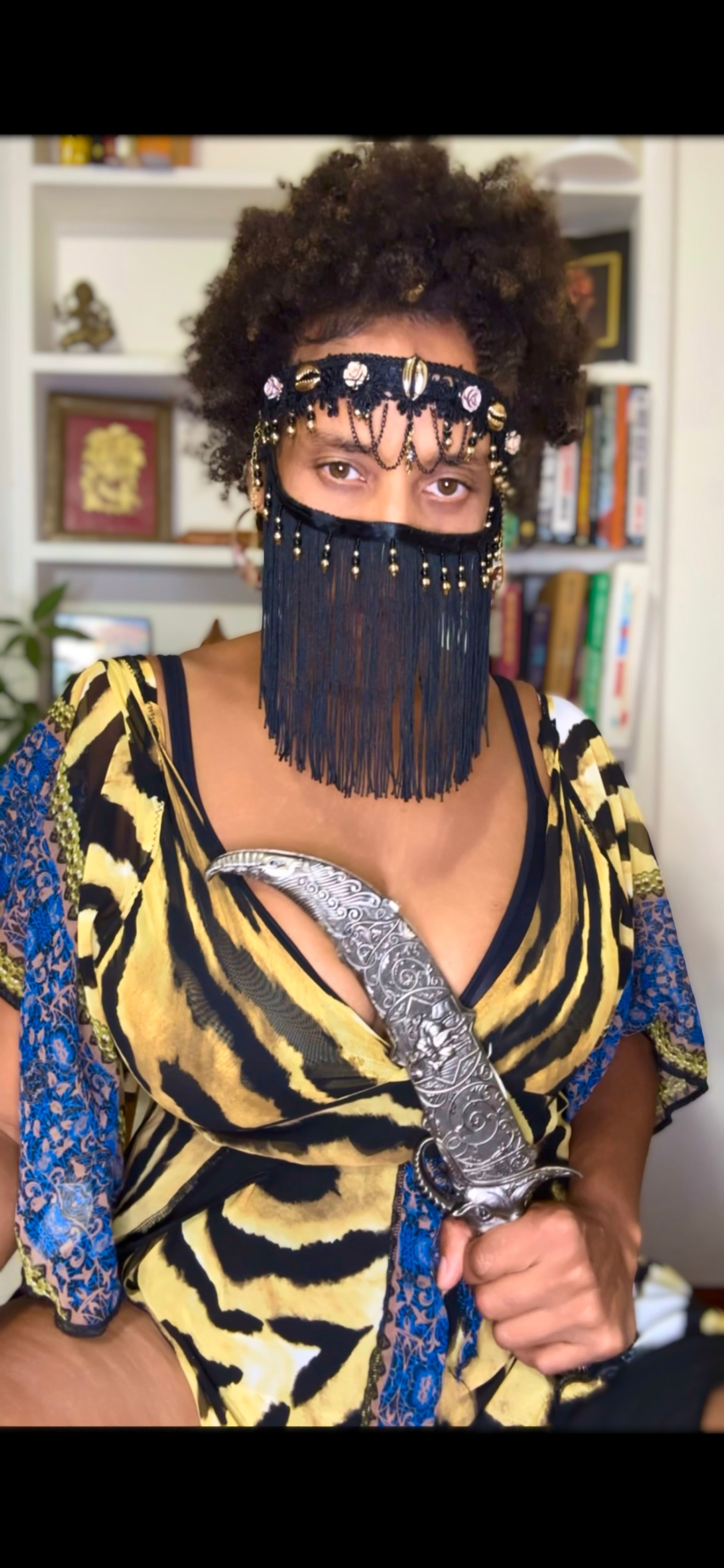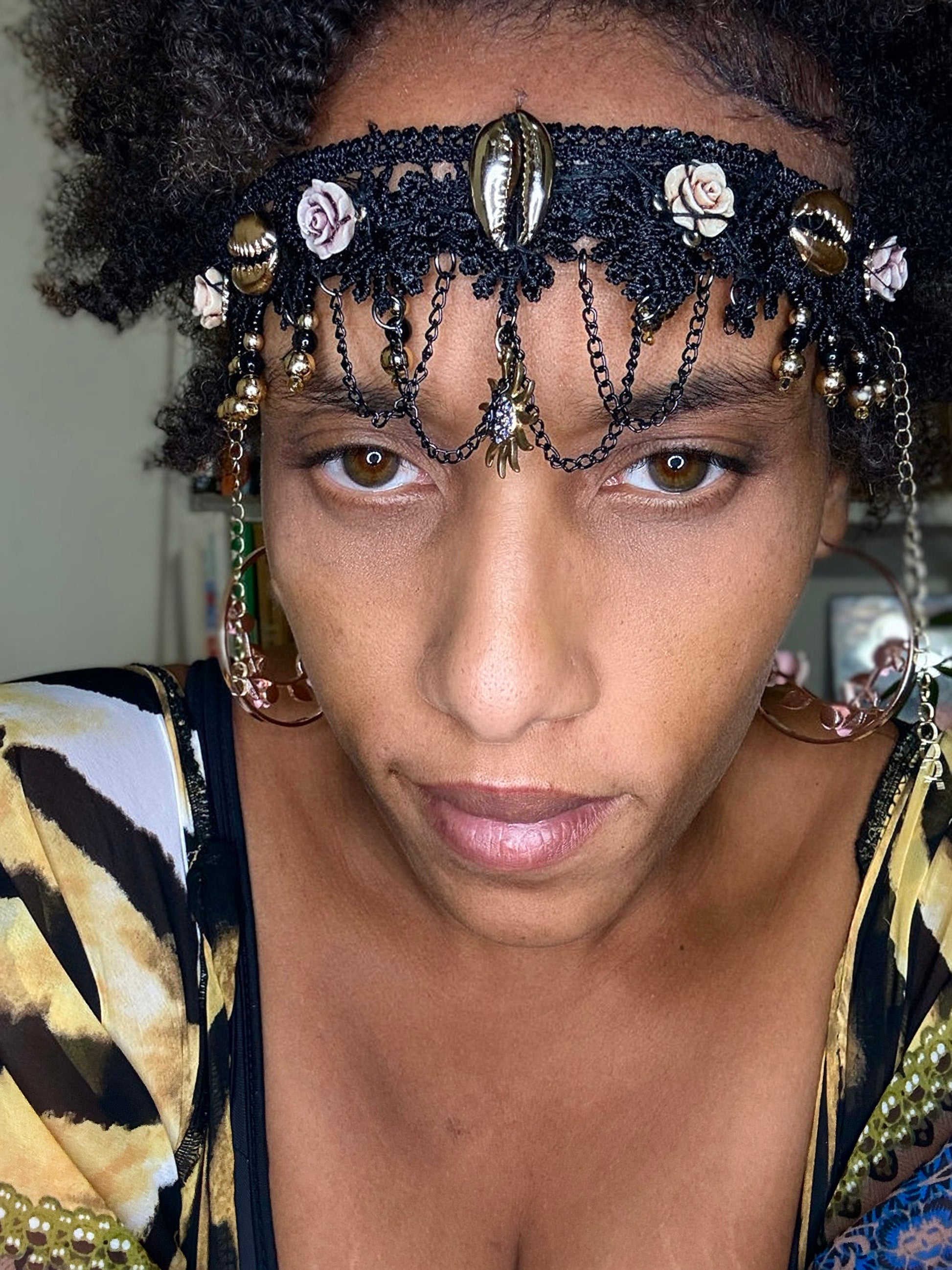 One of a kind hand sewn veil. 2 in one head band and Veil detaches at sides and adjustable to length allowing you to wear this art piece in multiple ways. Featuring lace, Roses & Cowrie shells.